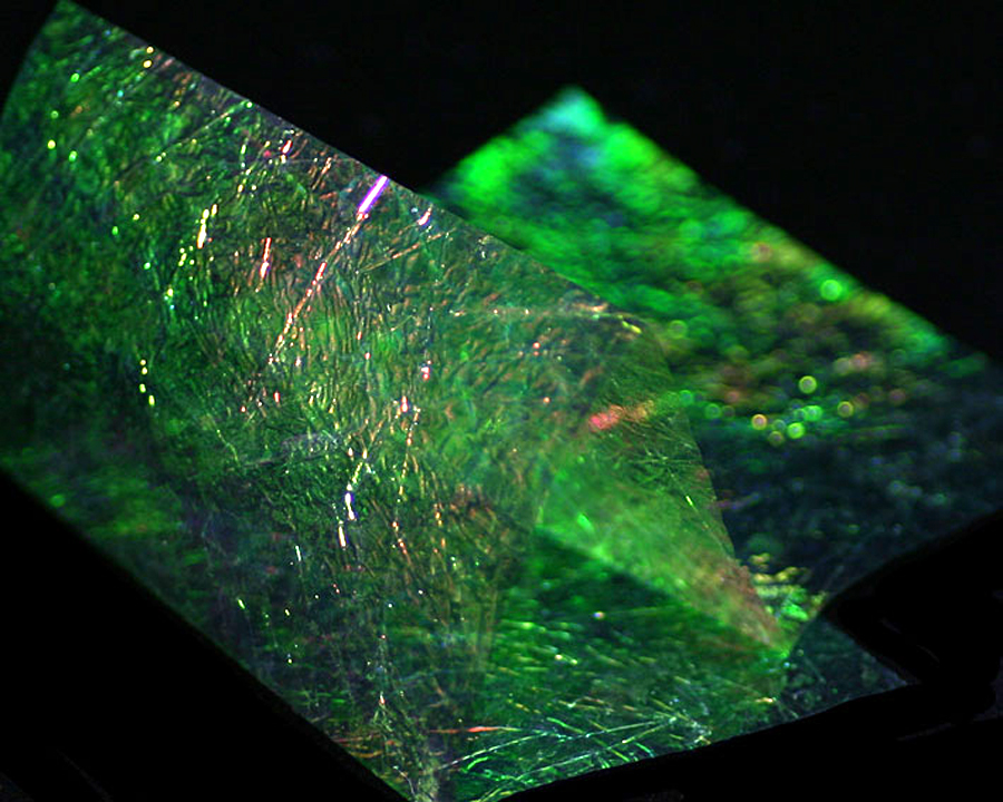 Velmi jemná fólie s iridiscentním leskem. Vynikající na hřbítky malých vzorů českých nymf, blešivců a pod.