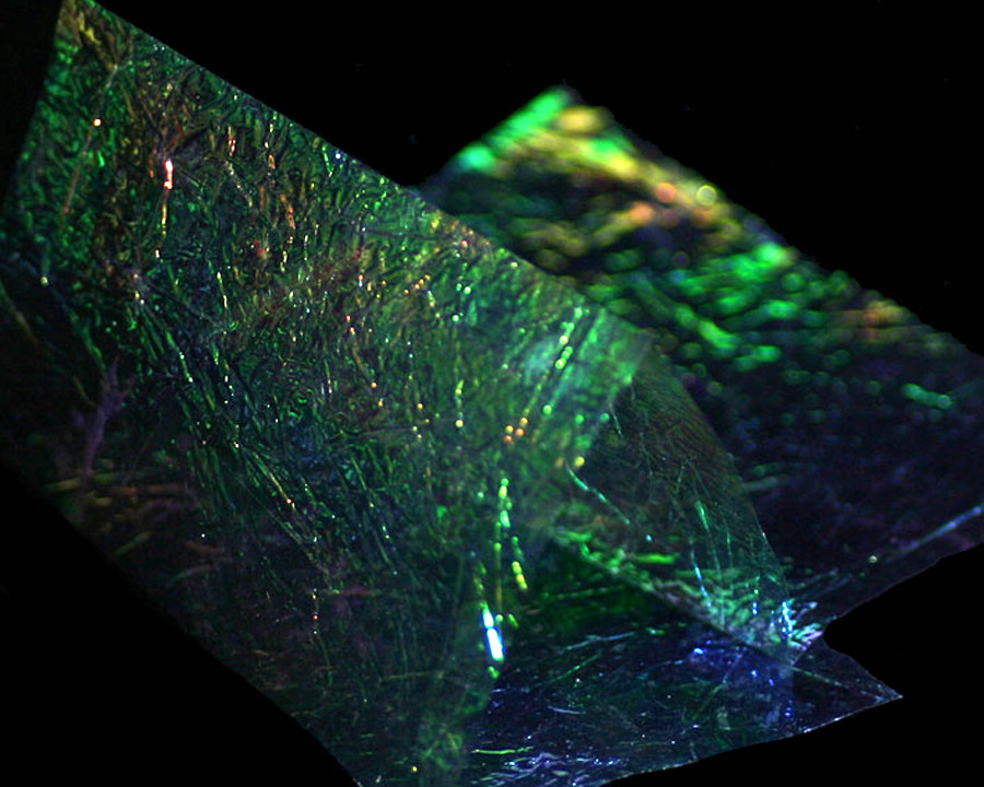 Velmi jemná fólie s iridiscentním leskem. Vynikající na hřbítky malých vzorů českých nymf, blešivců a pod.
