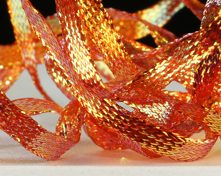 Nová verze pletené stuhy s velmi silným iridiscentním leskem. Vynikající na hřbítky českých nymf, blešivců, kroužkování streamerů a pod. Univerzální šířka cca 3,5 mm.
