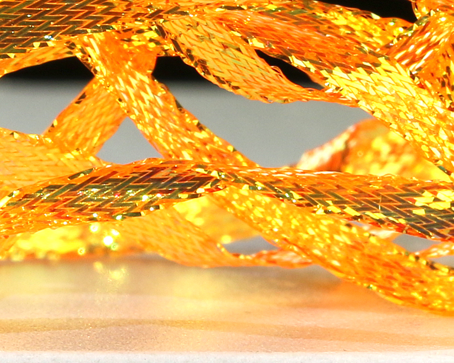 Nová verze pletené stuhy s velmi silným iridiscentním leskem. Vynikající na hřbítky českých nymf, blešivců, kroužkování streamerů a pod. Univerzální šířka cca 3,5 mm.