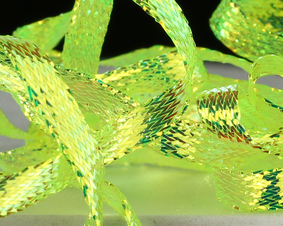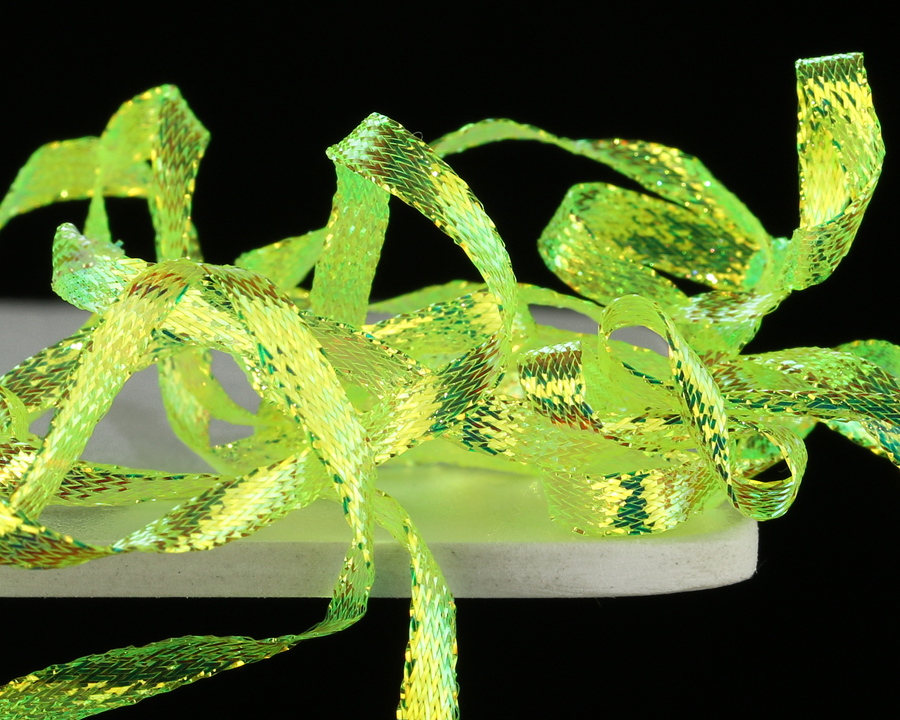 Nová verze pletené stuhy s velmi silným iridiscentním leskem. Vynikající na hřbítky českých nymf, blešivců, kroužkování streamerů a pod. Univerzální šířka cca 3,5 mm.