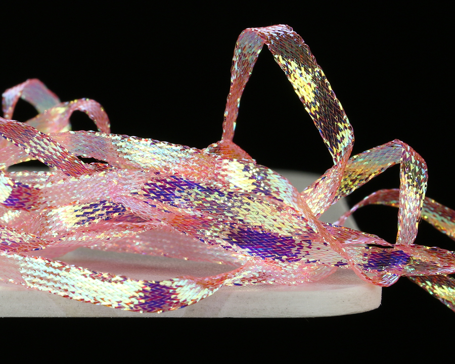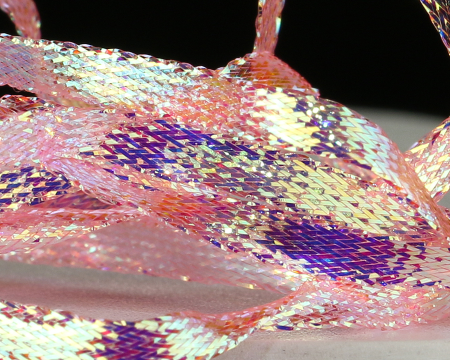 Nová verze pletené stuhy s velmi silným iridiscentním leskem. Vynikající na hřbítky českých nymf, blešivců, kroužkování streamerů a pod. Univerzální šířka cca 3,5 mm.