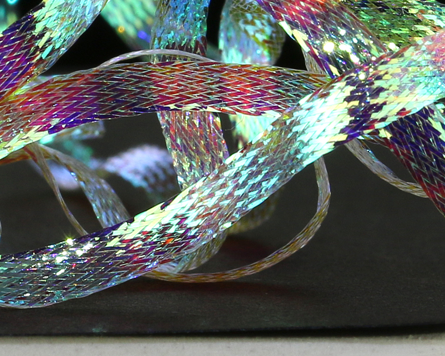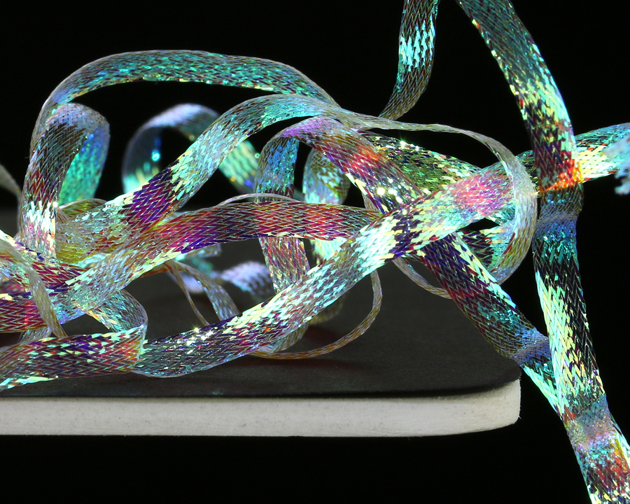 Nová verze pletené stuhy s velmi silným iridiscentním leskem. Vynikající na hřbítky českých nymf, blešivců, kroužkování streamerů a pod. Univerzální šířka cca 3,5 mm.