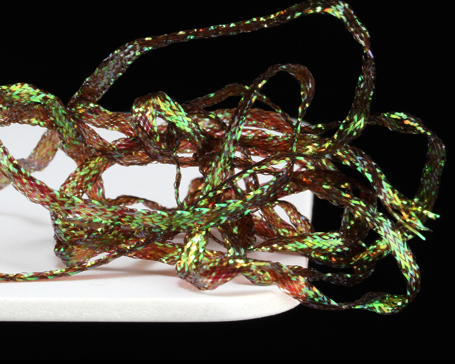 Pletená stuha s iridiscentním leskem. Vynikající na hříbtky českých nymf, blešivců, kroužkování streamerů a pod.