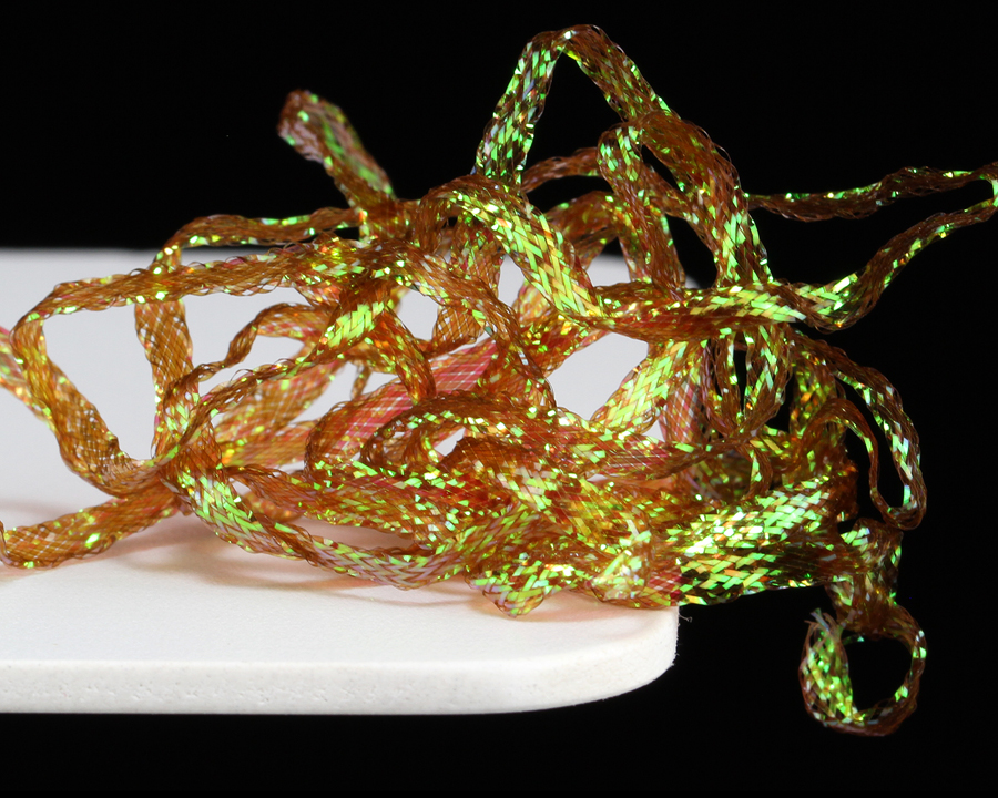 Pletená stuha s iridiscentním leskem. Vynikající na hříbtky českých nymf, blešivců, kroužkování streamerů a pod.