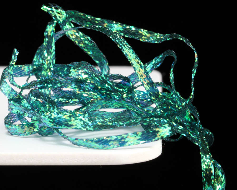 Pletená stuha s iridiscentním leskem. Vynikající na hříbtky českých nymf, blešivců, kroužkování streamerů a pod.