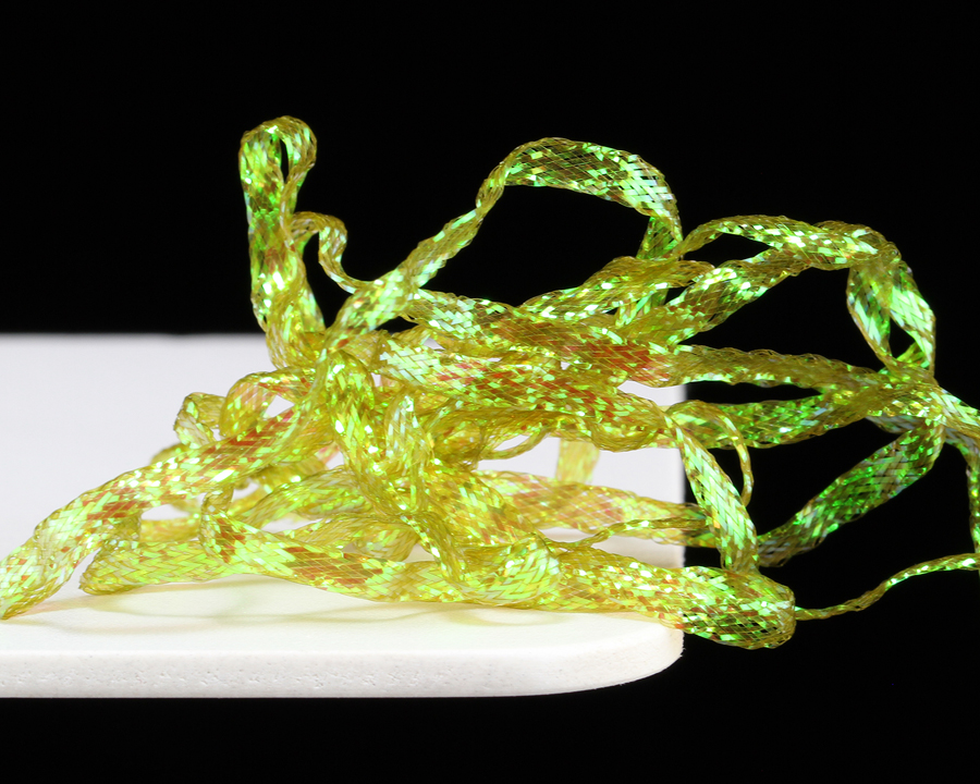 Pletená stuha s iridiscentním leskem. Vynikající na hříbtky českých nymf, blešivců, kroužkování streamerů a pod.