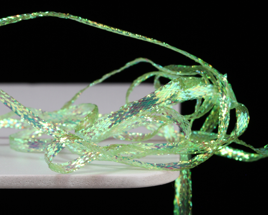 Pletená stuha s iridiscentním leskem. Vynikající na hříbtky českých nymf, blešivců, kroužkování streamerů a pod.