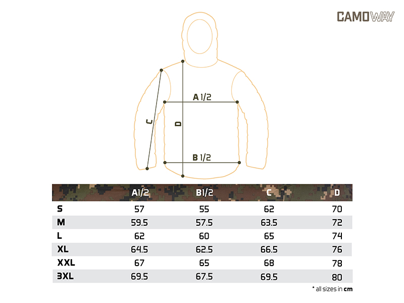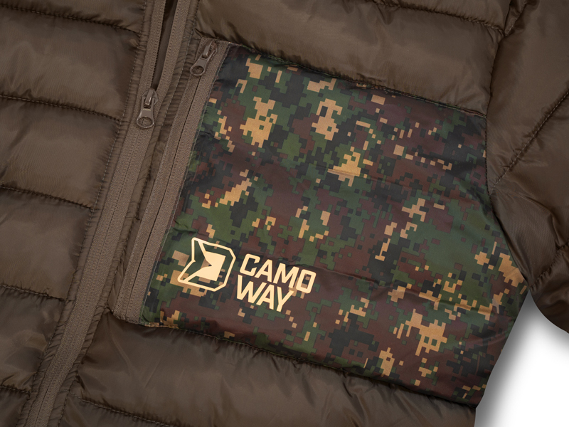 Další kapsu naleznete na levé straně na hrudi a slouží k uschování mobilního telefonu, případně dokladů. Bunda CamoWAY disponuje také kapucí, kterou lze zatáhnout pomocí stahovacího klipu. Rukávy jsou na koncích mírně zúžené a opatřené jemnou gumičkou, pro lepší obepnutí zápěstí. Design se skládá z tmavě hnědé barvy zkombinované s digitálním camo vzorem doplněným stylovým logem CamoWAY ve světlé barvě.