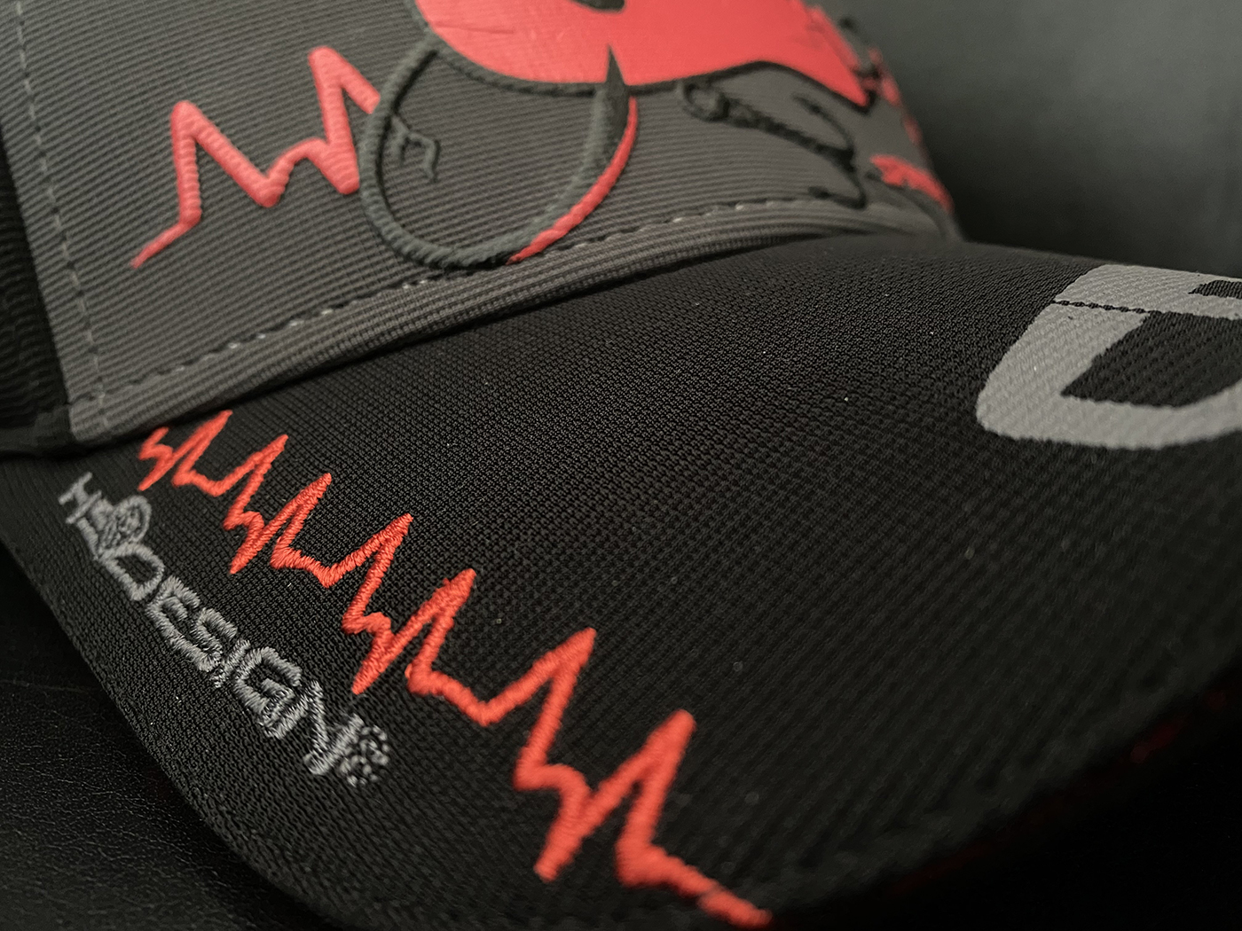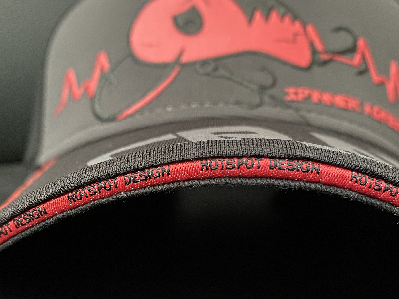 Přední část čepice: Nástraha v dobře viditelném reliéfním potisku s „adrenalinovými“ linkami vyšívanými na obou stranách.