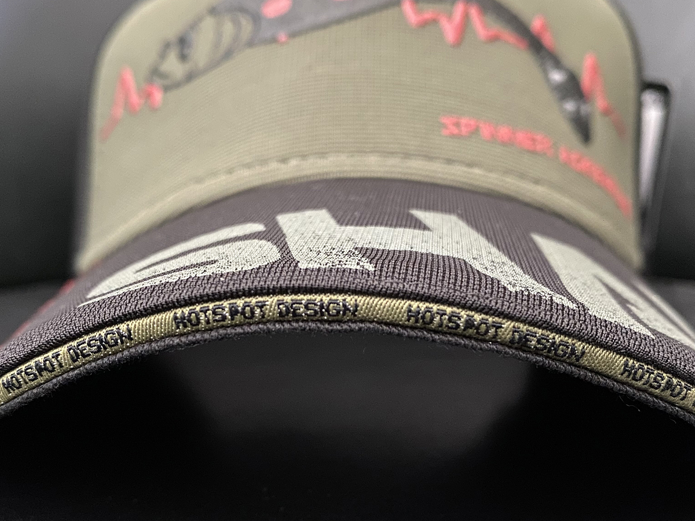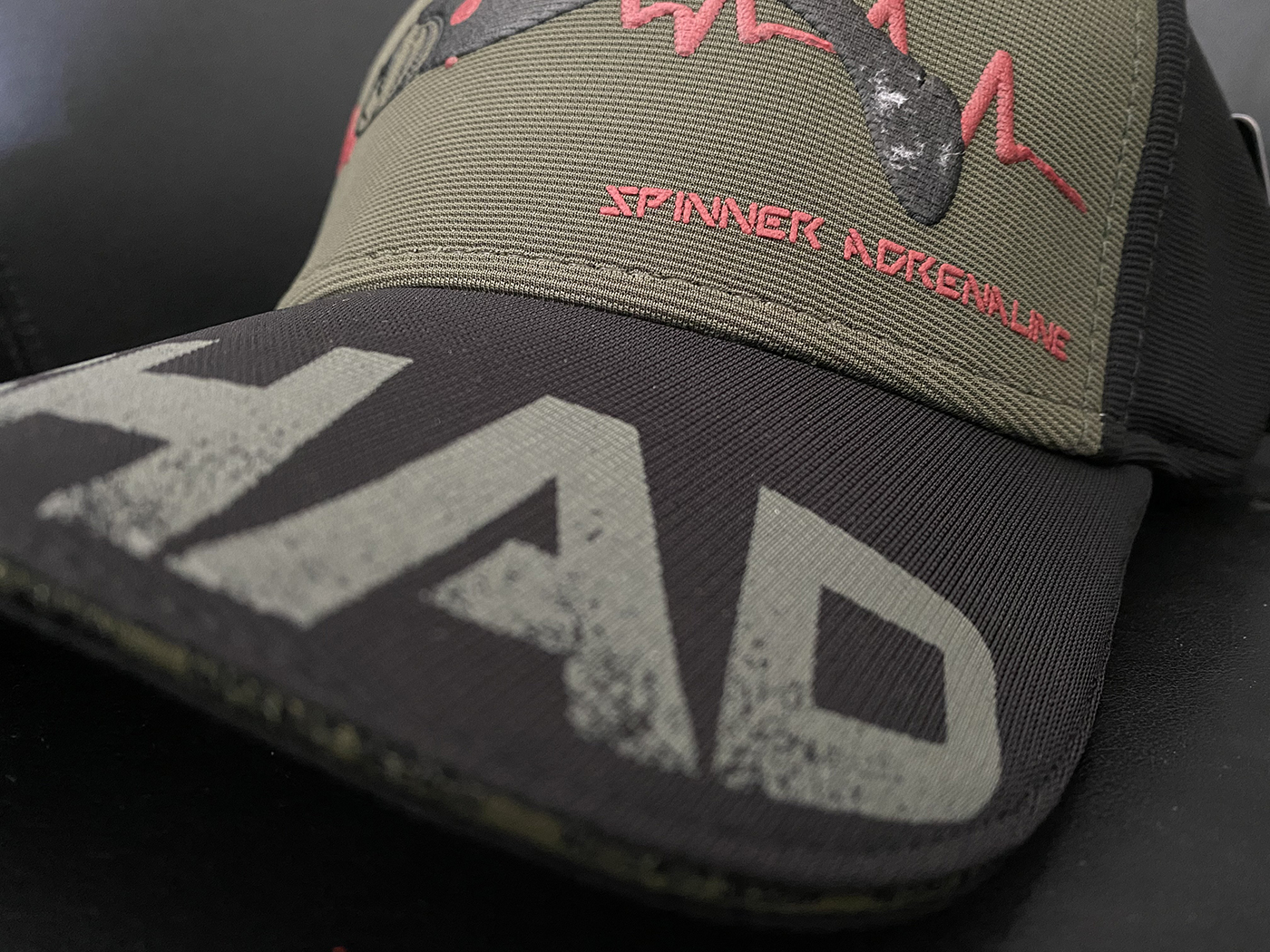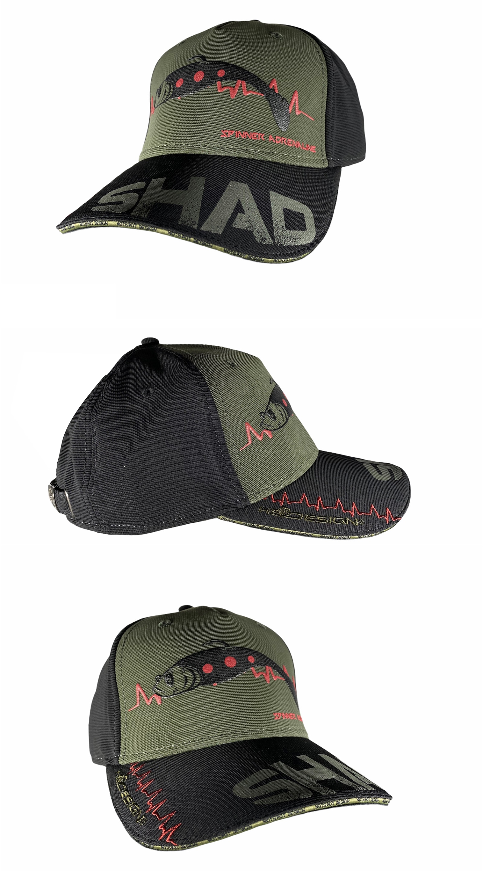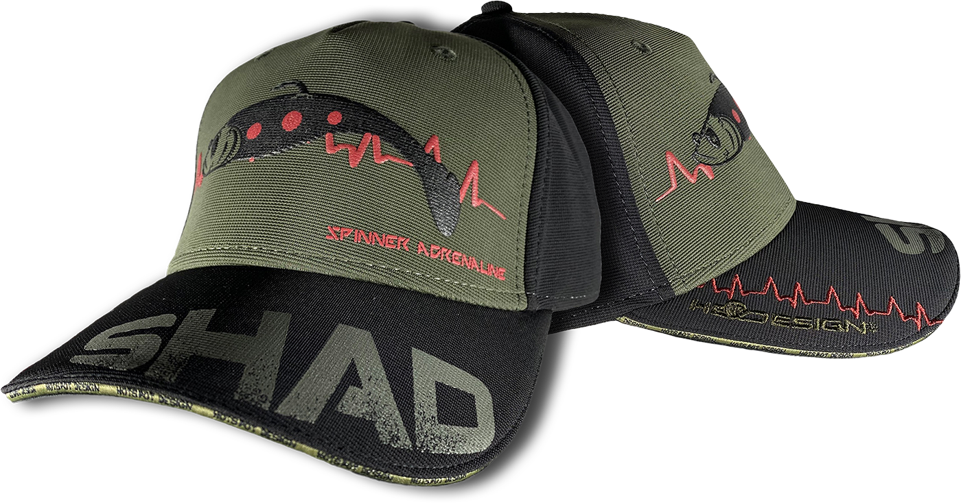 Přední část čepice: Nástraha SHAD v dobře viditelném reliéfním potisku s „adrenalinovými“ linkami vyšívanými na obou stranách. Kšilt: Text SHAD v dobře vytištěném reliéfním tisku a „adrenalinová“ linie s vyšívaným logem Hotspot Design. Na přední straně kšiltu logem Hotspot Design v kontrastní barvě vytištěné po celé délce. Zadní část: kovová spona pro nastavení obvodu čepice. Na logu pásky vyšívaný nápis Hotspot Design. Spona s logem Hotspot Design