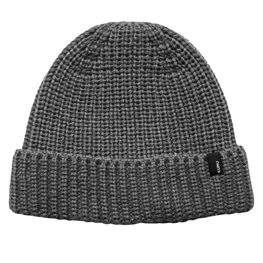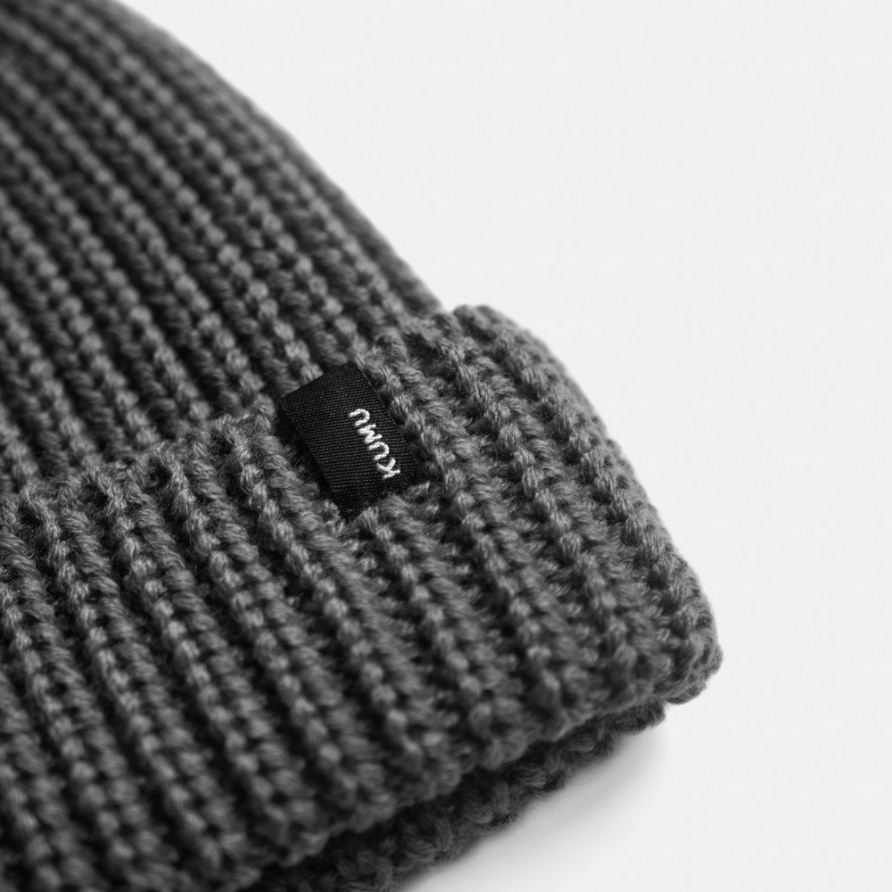 Super měkká a robustní žebrovaná pletenina v šedé barvě s tkaným značkovým poutkem na ohrnutí univerzální velikosti. Dostupné v khaki, černé, hořčicové a šedé barvě.