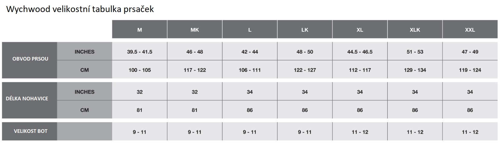 zakončení prsaček elastickým páksem, který má navíc ocelový háček k přichyení na tkanički brodících bot, ochrana proti vniknutí štěrku a nečistot do bot