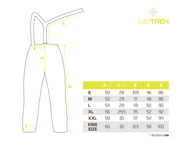 Kalhoty WinTREK disponují kapsami na zip po obou bocích, přičemž zipy jsou prošity výraznou žlutou textilií a překryty lemem z voděodolné tkaniny. Na pase se nacházejí gumové kšandy nastavitelné dle vaší výšky a kompletně odepínatelné na suché zipy. Samotný pás disponuje všitou gumičkou zvyšující jeho flexibilitu a pružnost. Vnitřní strana je tvořena hladkou prošívanou látkou, díky které se kalhoty snadno oblékají a dobře nosí.