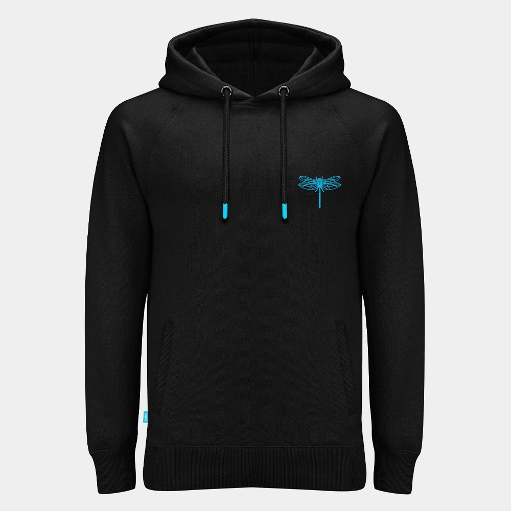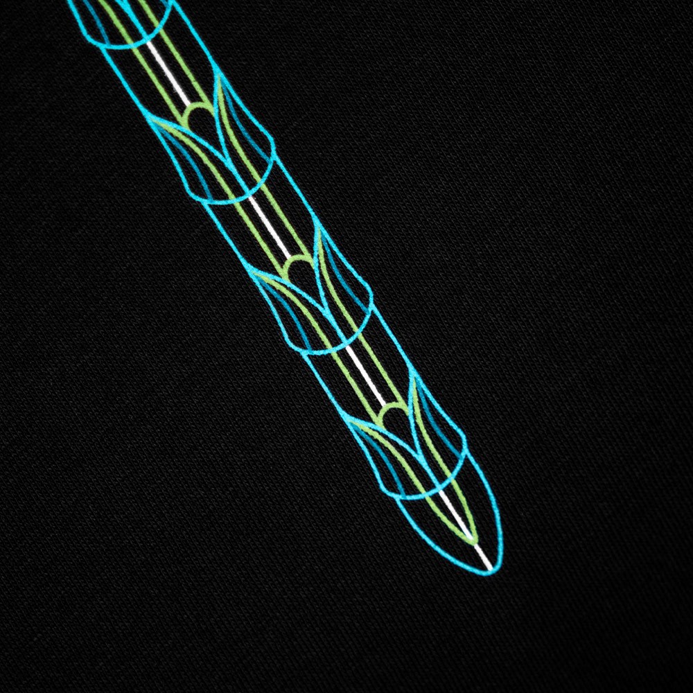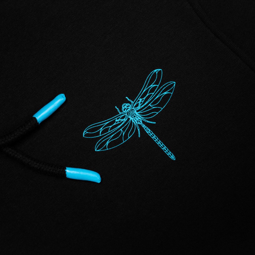 „Emperor“ je grafická pocta ikonickému vážce císařské. Design zachycuje složitosti její křehké struktury křídel prostřednictvím ilustračního stylu s klíčovými liniemi v elektrických modrých a zelených tónech. Tisk je proveden pomocí 5barevného sítotisku na našich super měkkých, luxusních látkách o gramáži 320 g, s kartáčovaným zadním povrchem. Součástí designu jsou také barevně laděné konce šňůrek a detailní tkanička na boku, což podtrhuje preciznost a vysokou kvalitu provedení.
