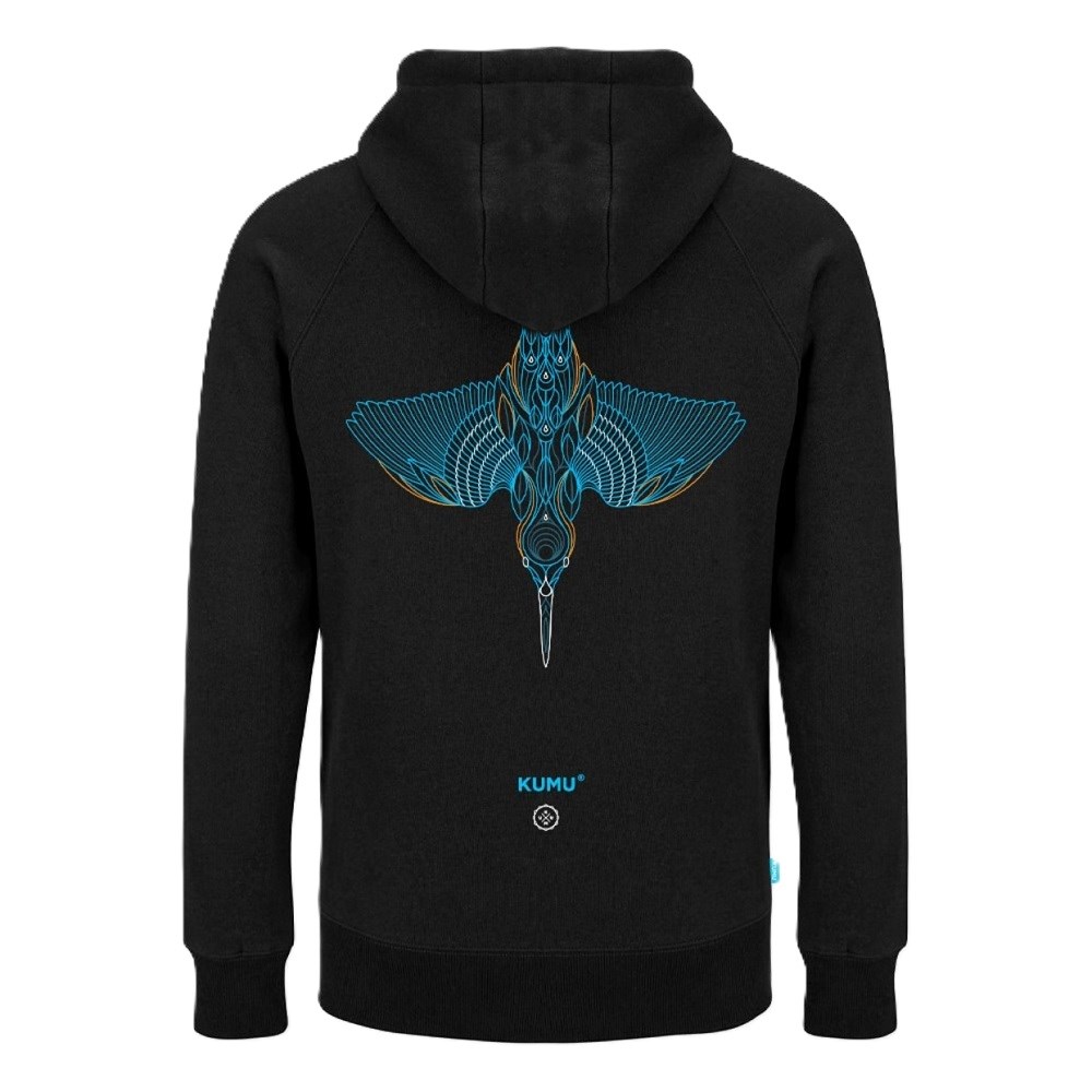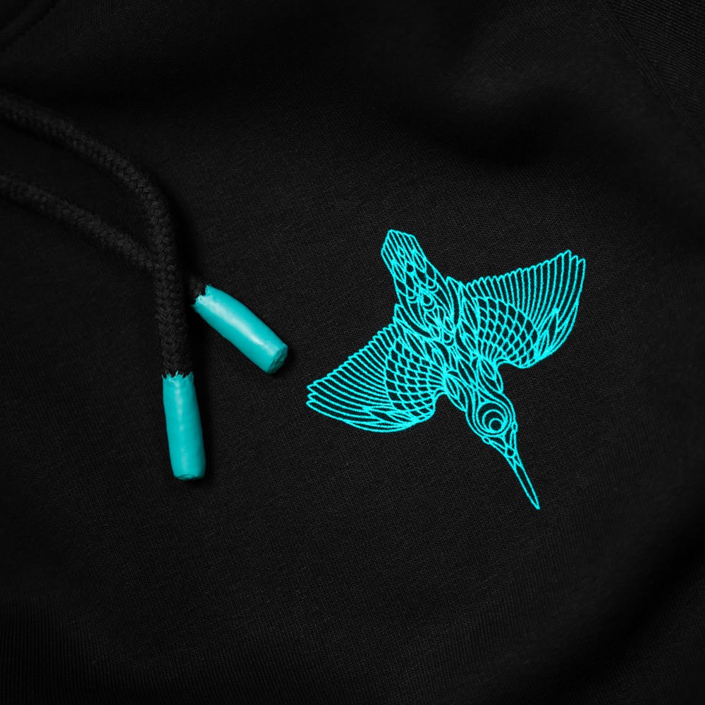 Při tvorbě tohoto motivu jsme použili ilustrace klíčové linie, abychom dosáhli pocitu rychlého pohybu, ve kterém následně krásně vyniknou elektricky modré a měděné odstíny. Celý efekt pak působí téměř 3D dojmem. Čtyřbarevný sítotisk na naší super měkké luxusní 320g česané tkanině s barevně sladěnými konci stahovací šňůrky.