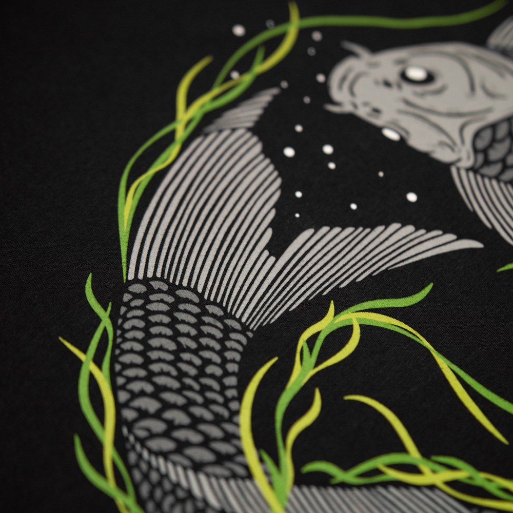 Další skvělá práce Stephena Maye zobrazuje dva kapry kroužící ve vodní trávě. Grafika Vortex je od základu ručně kreslená a znovu dokazuje Stephenovu genialitu. Pětibarevný sítotisk z tlumených šedých odstínů a kontrastní zelenou barvou na naší super měkké a luxusní 320g česané bavlně s barevně sladěnými máčenými konci stahovacích šňůrek.