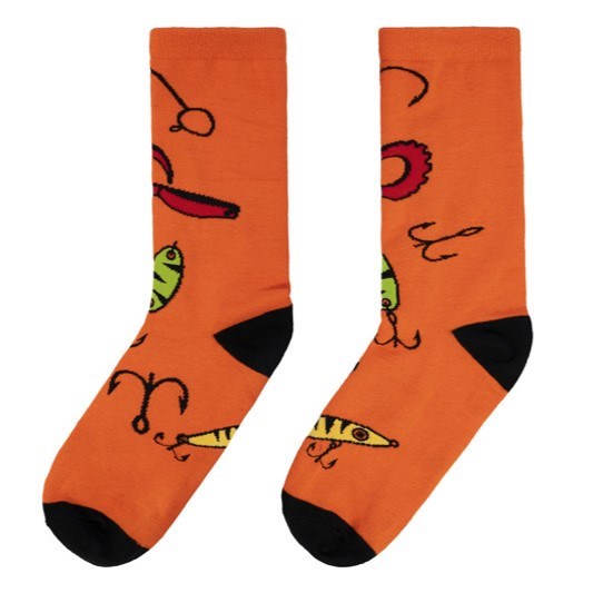 Oranžové ponožky ATAK nenechají chladného ani jednoho vláčkaře. A to zejména kvůli motivu, který je na nich zobrazen. Nástrahy, jigy, háčky, přesně to jsou prodkuty, které má správný lovec dravých ryb vždy po ruce, nebo jako v tomto příapdě na nohou :).