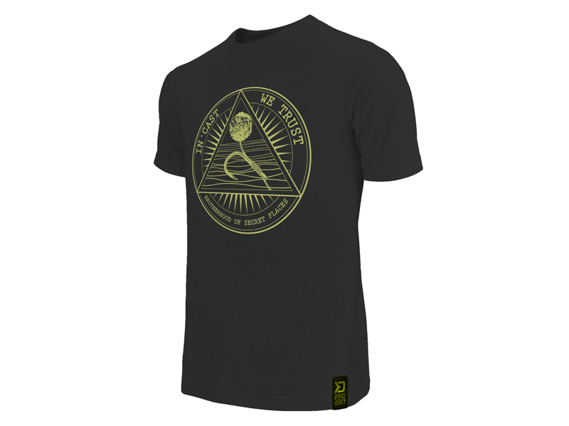 Vyrobeno je z příjemného materiálu černé barvy a vyznačuje se kvalitním zpracováním, ať už samotného trička nebo potisku. Vepředu vyniká neotřelým motivem, který v sobě nese tajemný rybářský odkaz IN a CAST WE TRUST (věříme v nahazování). Design trička vkusně doplňuje také motiv těsně pod lemem krku na zadní straně.