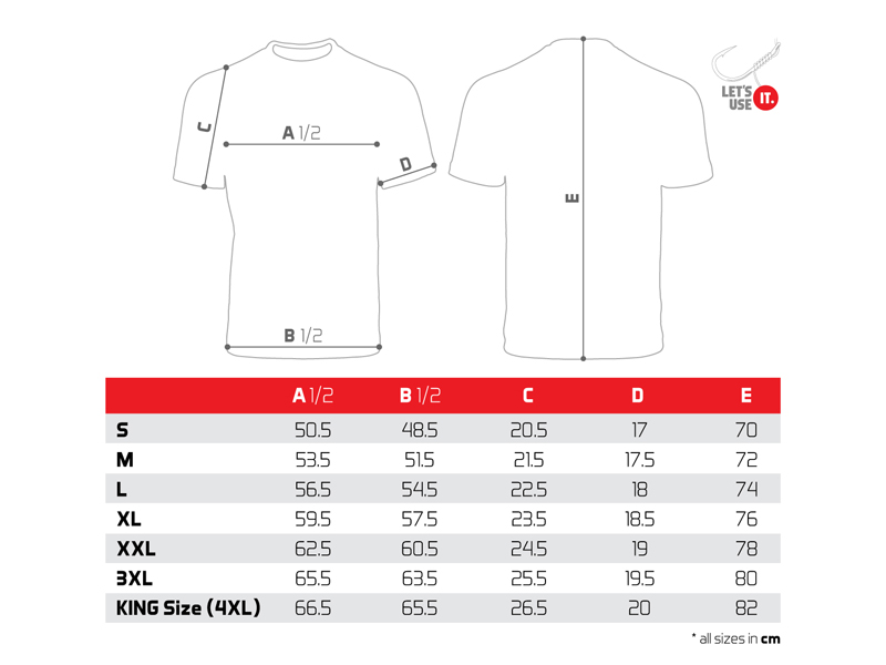 Samotné tričko je vysoké kvality, stejně jako použitý barevný tisk. Nabízíme je v široké škále velikostí od S až po KING SIZE (ekvivalent 4+XL, který je ve většině zemí označován jako XXXXXL). Model King size tedy hravě oblékne i ty nejstatnější rybáře o hmotnosti 135kg+.