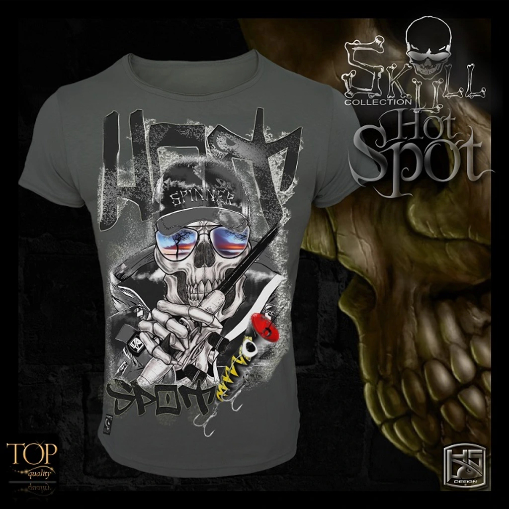 Čtyři nová trička s odlišným designem a čtyřmi novými barvami, výsledkem je mladší a moderní sbírka v dokonalé kombinaci elegance a inovace. Tato kolekce triček nesmí chybět žádnému rybáři. Tričko Skull HOT SPOT je vyrobeno ve světle grafitové barvě a nese znaky našeho speciálního designu, lebka má na sobě naši Spinner Adrenaline bundu a čepici s naším „Spinner“ designem. V odrazu brýlí rybář hledá klasické „Hot Spot“, které je vyrobeno ve čtyř-barevném tisku s vysokým rozlišením.