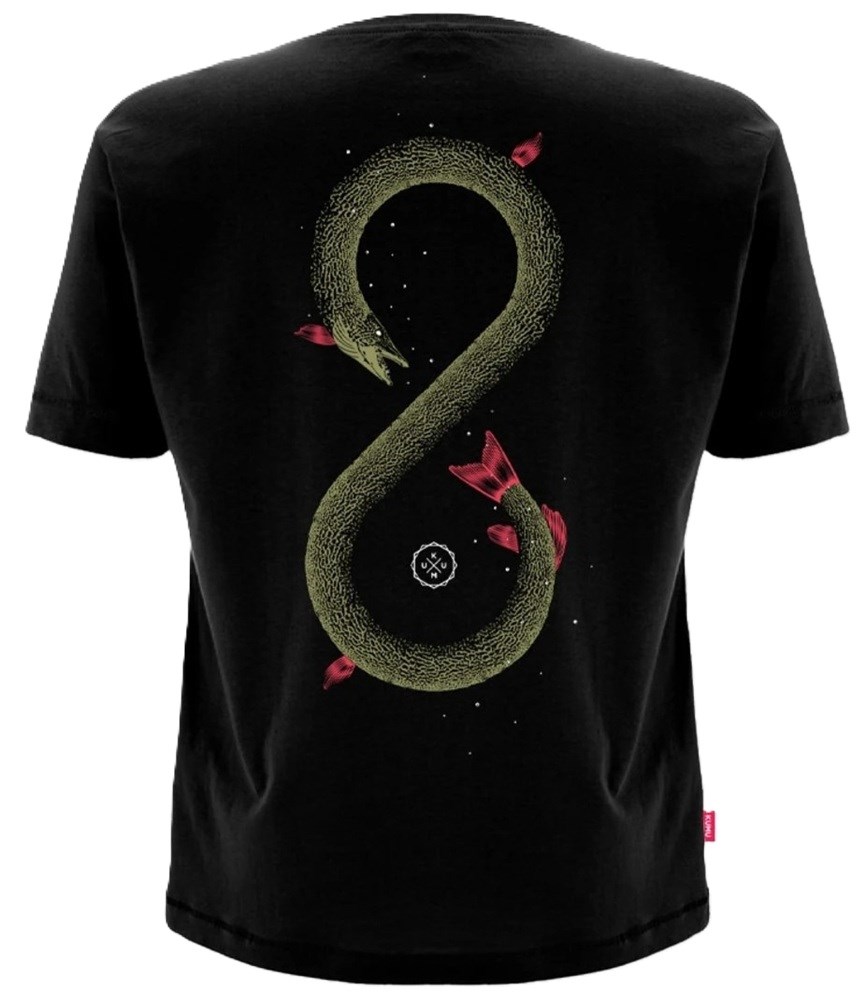 Naše grafika s Ouroborem, odkazující na starověký symbol „Ouroborus“, který zobrazuje hada nebo draka požírajícího svůj vlastní ocas, symbolizuje kruh života a to, jak štiky ovládají své vlastní počty tím, že pojídají svůj vlastní druh. Tato výrazná grafika, ručně kreslená od základu, zvěčňuje tohoto zuřivého predátora. Zářivý tříbarevný sítotisk na super měkké 150g organické látce s tkanými detaily na boční straně.