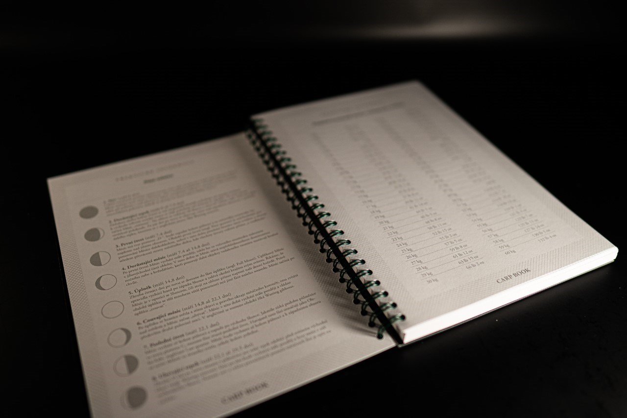 CARP BOOK – kaprařský deník, který může zásadně rozšířit vaše obzory při rybolovu. Naleznete v něm praktické informace jako je vázání základních kaprařských uzlů, porozumíte fázím měsíce, které mohou být při lovu také velmi důležité, milovníci UK stylu v něm najdou přepočty hmotností z kilogramů na libry a nakonec je tu samotný deník.